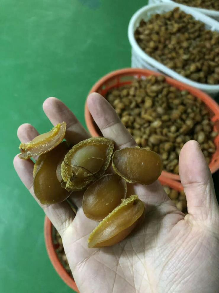 將取出洗凈的鮑魚肉加6 %的精鹽拌勻,腌在盆或缸中,8小時后取出,在海水中悄悄搓洗,去掉鮑肉邊際殘留的黑色素和黏液,洗凈瀝水。先將鍋中注入海水,水與鮑肉的份額為4:1即可,待水燒至80°C左右,把鮑肉投入鍋中,煮沸6分鐘左右即可撈出,放進冷開海水中,洗去污沫,瀝凈水分,即可出曬或許推入烘干房。