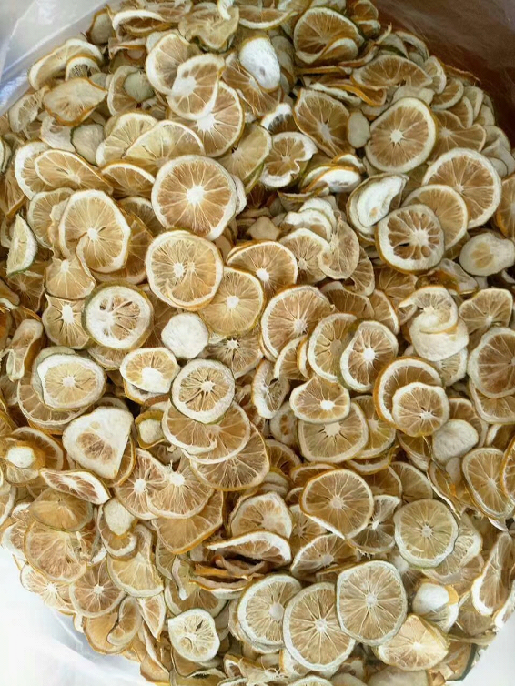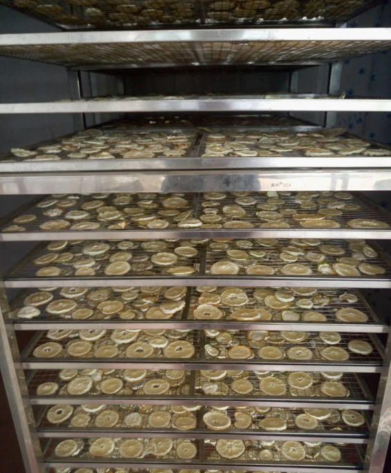將檸檬片迅速轉移至烘干房內,烘干溫度一般在50℃左右,溫度不能太高,因為檸檬本身含糖,溫度太高的話,糖分會焦化,導致烘干后的檸檬片發(fā)黑。據(jù)李總介紹,烘干2000~2500斤的檸檬片,需要配置一臺15P的閉式除濕烘干機,烘干溫度分為三個階段,溫度設置分別為43℃、45℃、50℃。檸檬片烘干最高溫度不能超過60℃,保持中低溫烘干,減少營養(yǎng)成分的流失,烘干時間約為15~20小時,具體需要根據(jù)檸檬的成熟度、切片的厚度和烘干季節(jié)等來確定。(僅供參考,不可簡單套用)